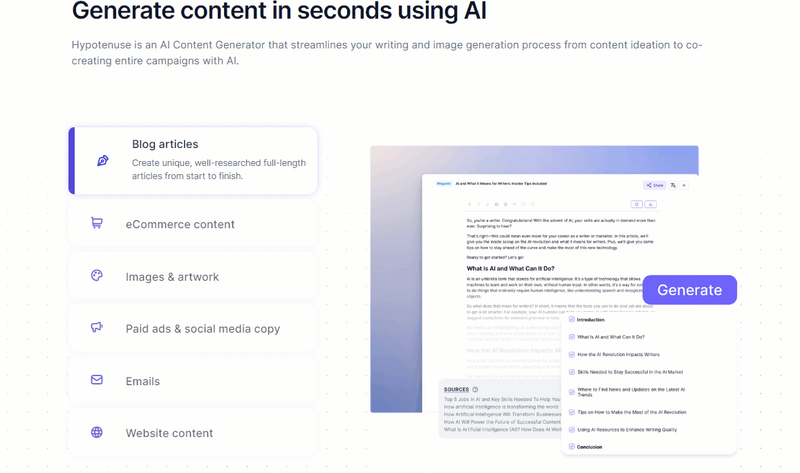 Hypotenuse AI is an innovative content generation platform that harnesses the power of the advanced GPT-4 language model to produce high-quality, well-researched written content and visually engaging artwork within seconds. This versatile platform is designed to cater to various industries and offers a range of specialized tools to streamline the entire content creation process, making it easier for marketers, writers, and businesses to ideate, co-create, and produce exceptional content.